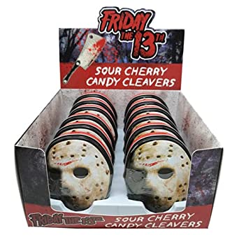Novelty candies, mints & gum by Boston America. For nutritional information see BostonAmerica.com Jason lives. The mask-shaped tin is filled with cleaver-shaped cherry sours.